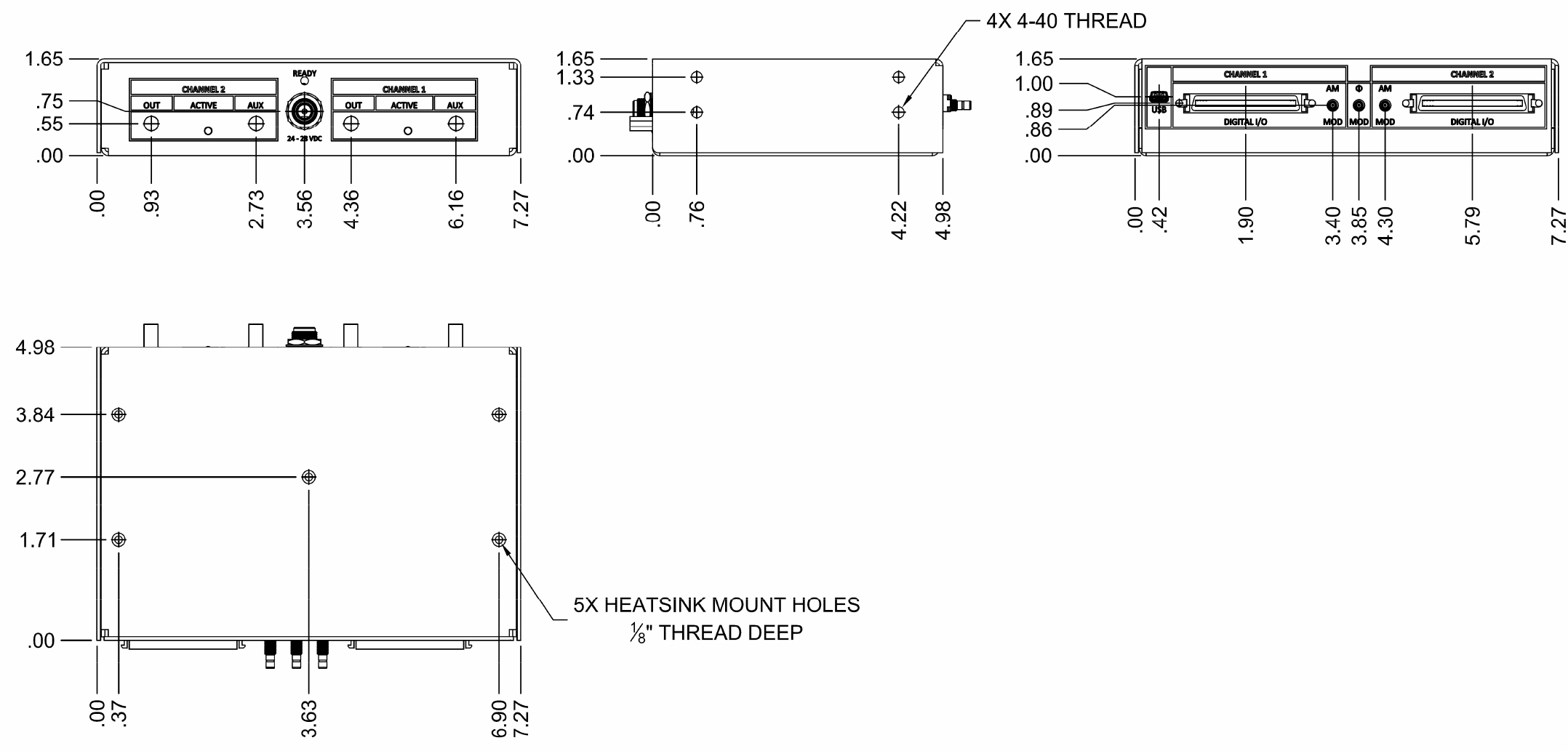 外形尺寸7.27''x4.98''x1.65'';外形圖:(尺寸單位為英寸)