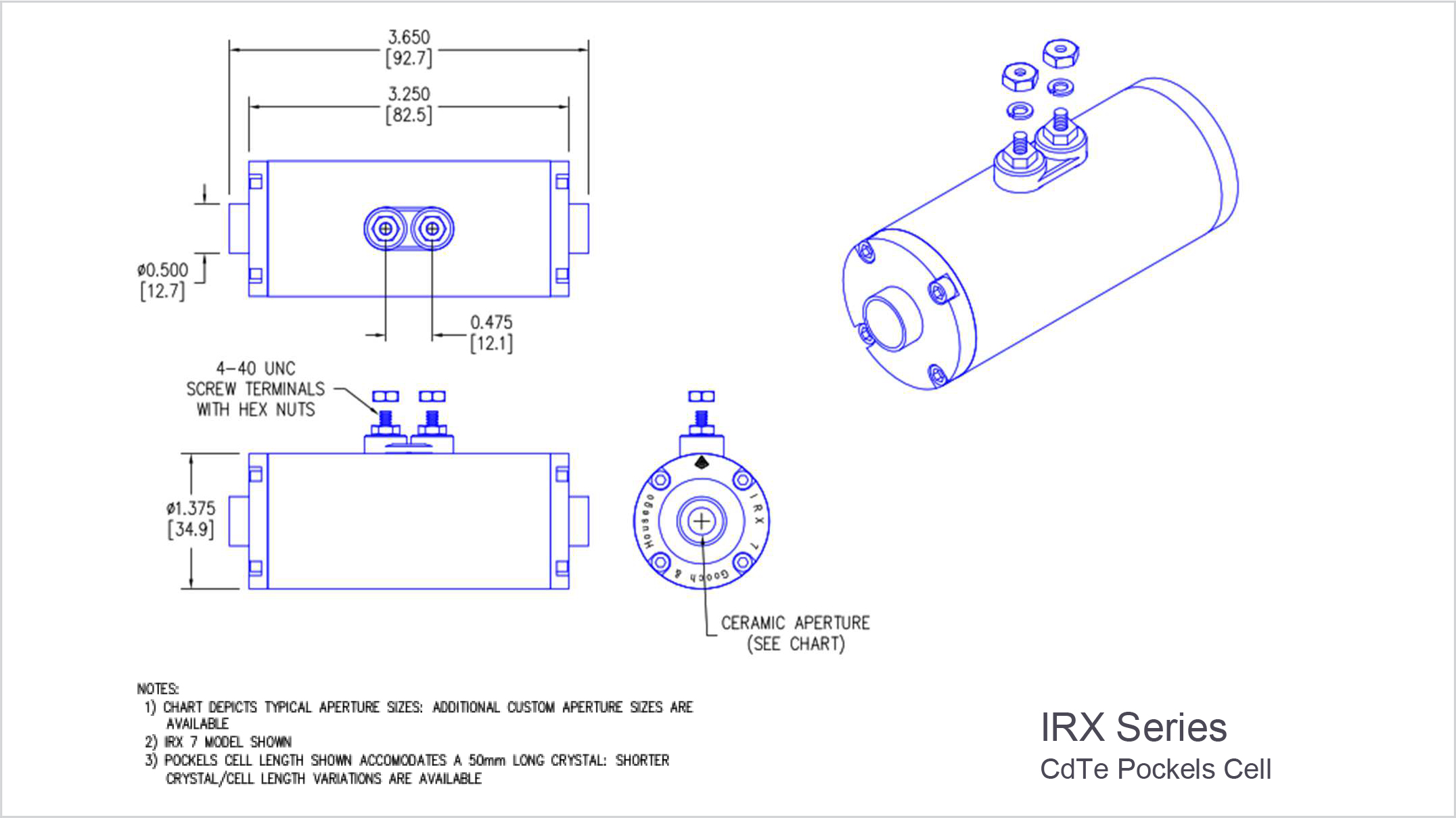 IRX系列CdTe普克爾盒在7.0–12μm波長(zhǎng)范圍內(nèi)工作,有效孔徑為3–10mm,重復(fù)頻率高達(dá)100kHz,在10.6μm處提供>500:1的電壓對(duì)比度。IRX系列具有專(zhuān)利設(shè)計(jì),可將CdTe晶體與外部環(huán)境隔離,從而延長(zhǎng)使用壽命,并提供水冷設(shè)計(jì)以提高平均功率處理能力。由于碲化鎘具有電光系數(shù)高和不易吸水的特性,它作為Q開(kāi)關(guān)主要用于3-12um波段,特別是二氧化碳激光器中。根據(jù)客戶要求,可以切成布儒斯特角端面,也可以根據(jù)客戶指定的激光波長(zhǎng)鍍膜。