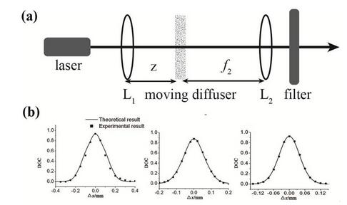 相干度大小腔外調(diào)控最常用的方法是通過(guò)動(dòng)態(tài)散射體(例如旋轉(zhuǎn)的毛玻璃、動(dòng)態(tài)液晶光調(diào)制器等)降低激光束的相干度大小,如圖4(a)所示,一束激光經(jīng)過(guò)透鏡L1聚焦后照射到動(dòng)態(tài)散射體,從動(dòng)態(tài)散射體出來(lái)的光束可以近似為非相干光束,經(jīng)透鏡L2以及濾波器組成的傅里葉變換系統(tǒng)之后,便可產(chǎn)生高斯謝爾模(GSM)光束(典型的部分相干激光束),通過(guò)控制透鏡L1到動(dòng)態(tài)散射體直接的距離z來(lái)控制動(dòng)態(tài)散射體上的聚焦光斑大小,當(dāng)聚焦光斑越大,得到的GSM光束的相干度越小。