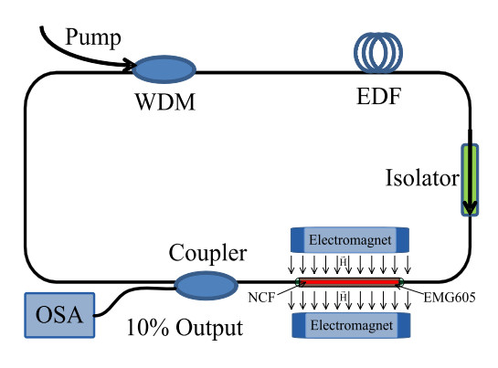 如下圖所示是用于磁場檢測的基于磁流體的光纖環(huán)形激光傳感器,在激光環(huán)型腔中接入涂覆有磁流體的單模-無芯-單模光纖結(jié)構(gòu),可以同時(shí)作為帶通濾波器和磁場傳感元件。基于自映像效應(yīng),外界磁場改變時(shí)會(huì)通過作用于磁流體從而改變單模-無芯-單模光纖結(jié)構(gòu)的濾波參數(shù)即輸出光譜波長,得到的帶通濾波邊模抑制比為14 dB,插入損耗約為-1.03 dB。當(dāng)外界磁場增大時(shí),激光波長藍(lán)移。在15.9 Oe到222.3 Oe的磁場范圍內(nèi)傳感靈敏度為12.05 pm/Oe。該傳感器具有高信噪比的輸出光譜、窄帶寬和高Q值等優(yōu)點(diǎn)。
