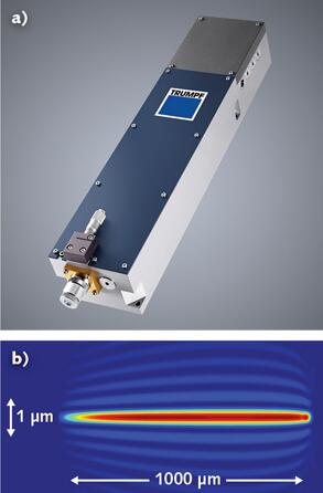 圖1:利用通快的Top Cleave光束整形鏡組切割堅硬的薄玻璃(a)。激光強度沿著光束的傳輸方向z軸均勻分布,形成一條長寬比大于1000:1的聚焦線(b)。激光脈沖一次性改性完整的內(nèi)部分割表面。