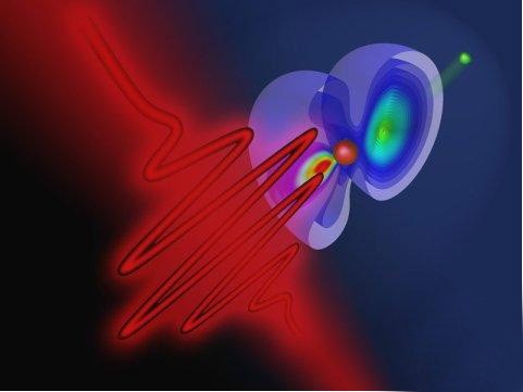 一個中性氦原子具有兩個電子。當(dāng)它被一個高能激光脈沖撞擊的時候,可以發(fā)生電離:其中一個電子被從原子中剝離出來并離開原子。這個過程發(fā)生在一個阿秒的時間尺度上——一阿秒是十億分之一秒的十億分之一。