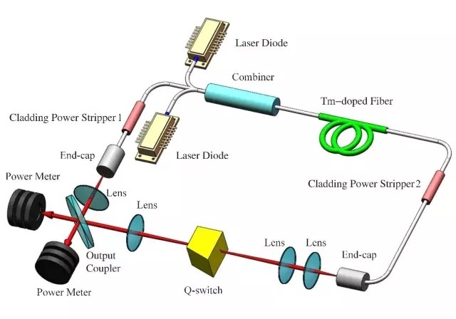 圖片說明:基于自由空間結構的主動調Q摻銩光纖環(huán)形激光器實驗裝置示意圖。在100 Hz重復頻率下,腔長為12 m時,獲得了單脈沖能量為150 μJ、脈沖寬度為382 ns的脈沖激光輸出。